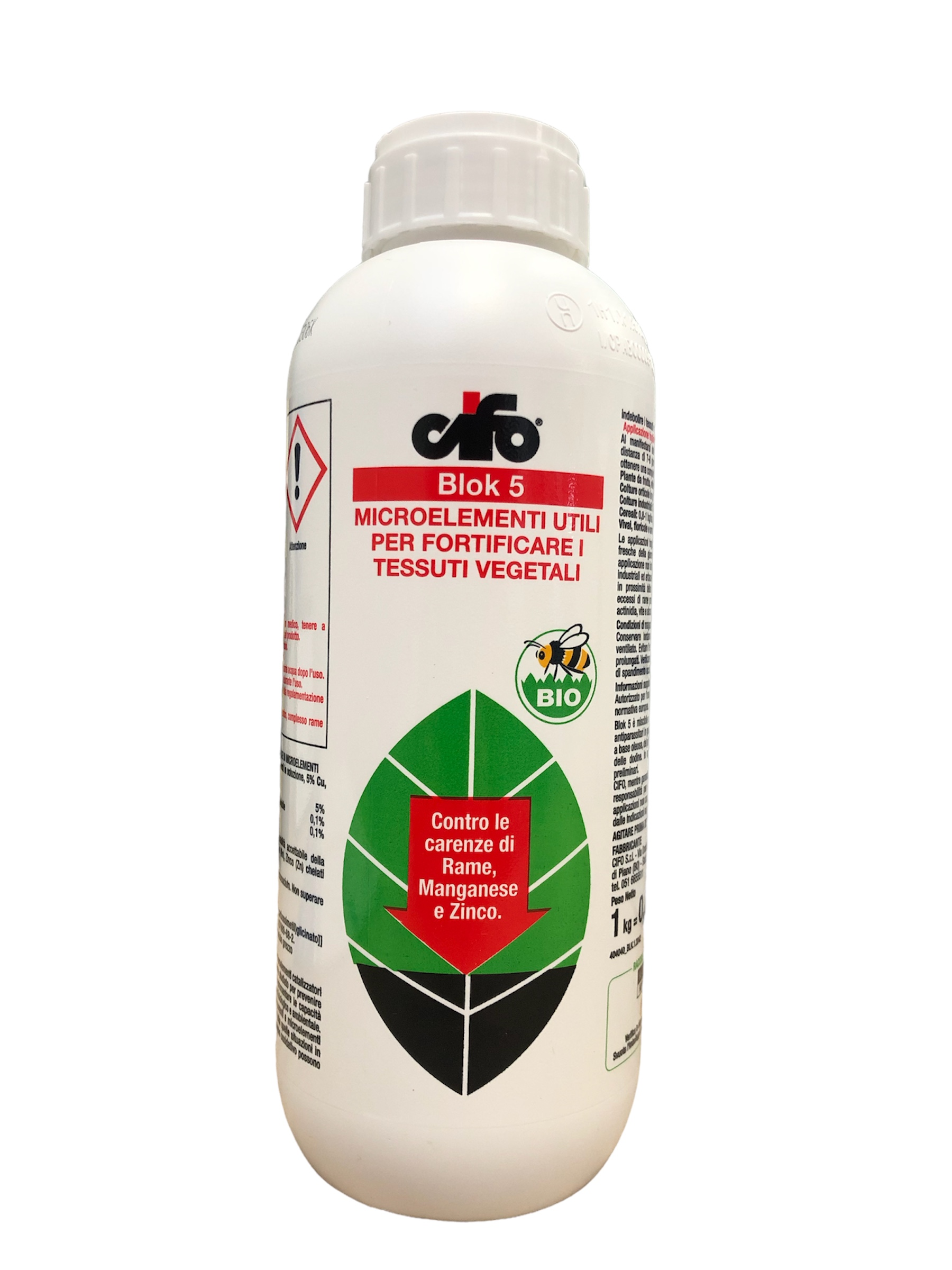 Blok 5 è un concime liquido a base di microelementi catalizzatori (rame, manganese e zinco) e coformulanti organici, appositamente studiato per prevenire e curare fisiopatie nutrizionali ed incrementare la resistenza della pianta a stress di natura parassitaria (funghi e batteri).